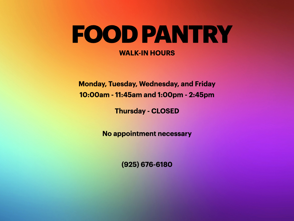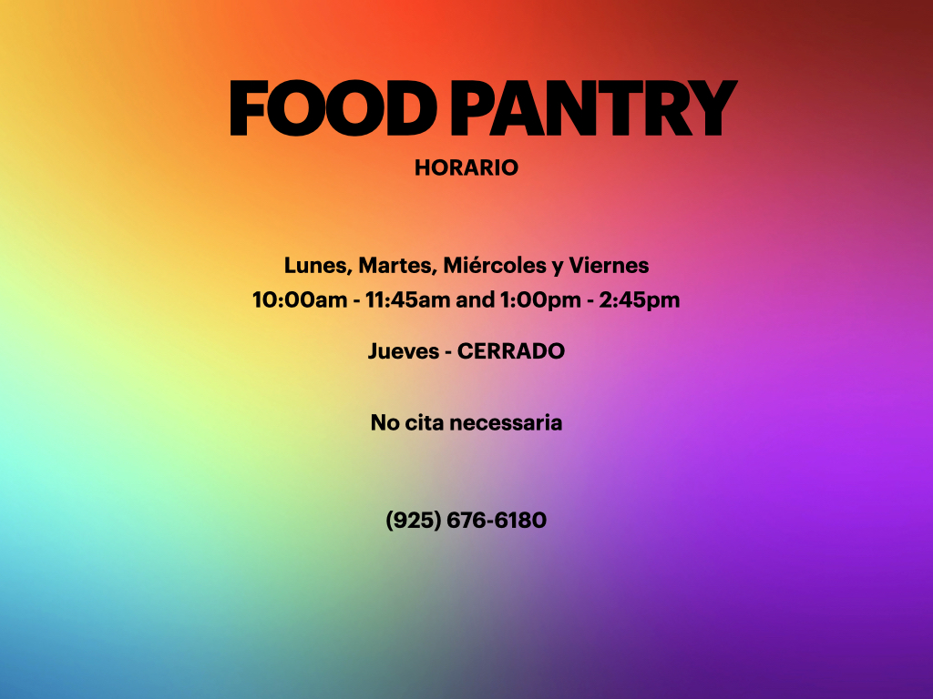 Si necesita ayuda con la comida, tenemos una despensa que está abierta los lunes, martes, miércoles y viernes.